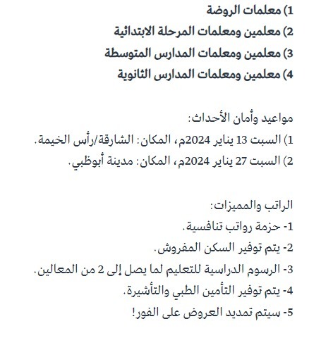 مطلوب معلمين ومعلمات للتوظيف المباشر في ابو ظبي و دبي ضمن الاختصاصات التاليةبواسطة admin / ديسمبر 11, 2023 للتقديم المباشر ارسال السيرة الذاتية على الايميل التالي : careers@gulfeducation.aeShare on FacebookTweet Post Views: 379