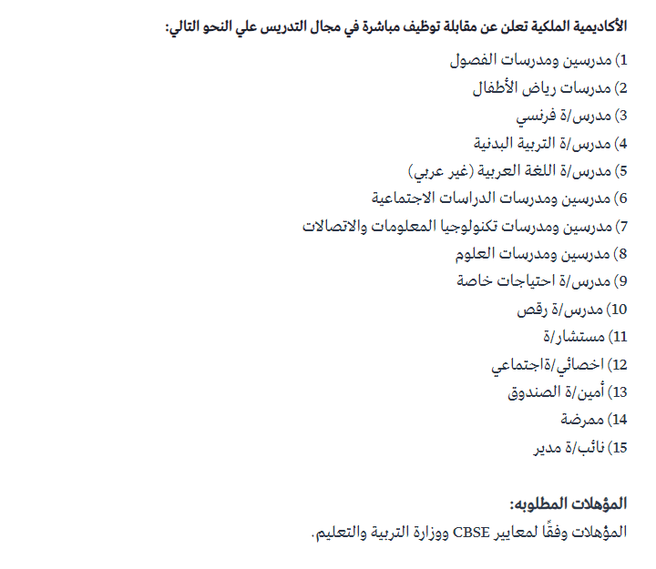 الأكادمية الملكية في الامارات تعلن عن مقابلات توظيف في مجال التدريس ضمن الاختصاصات التالية :