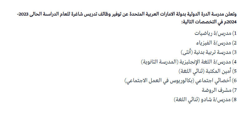تعلن مدرسة الدرة الدولية في الامارات عن توفر وظائف للعام الدراسي القادم