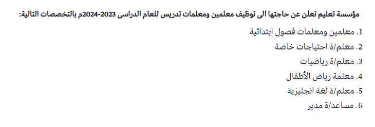 تعلن مؤسسة تعلم الخاصة عن حاجتها لتعيين مدرسين ومدرسات ضمن الاختصاصات التالية