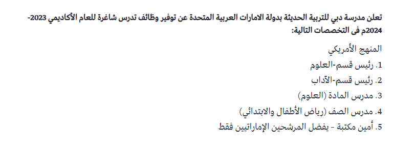تعلن مدرسة دبي للتربية الحديثة عن توفر وظائف للمدرسين ضمن التخصصات التالية