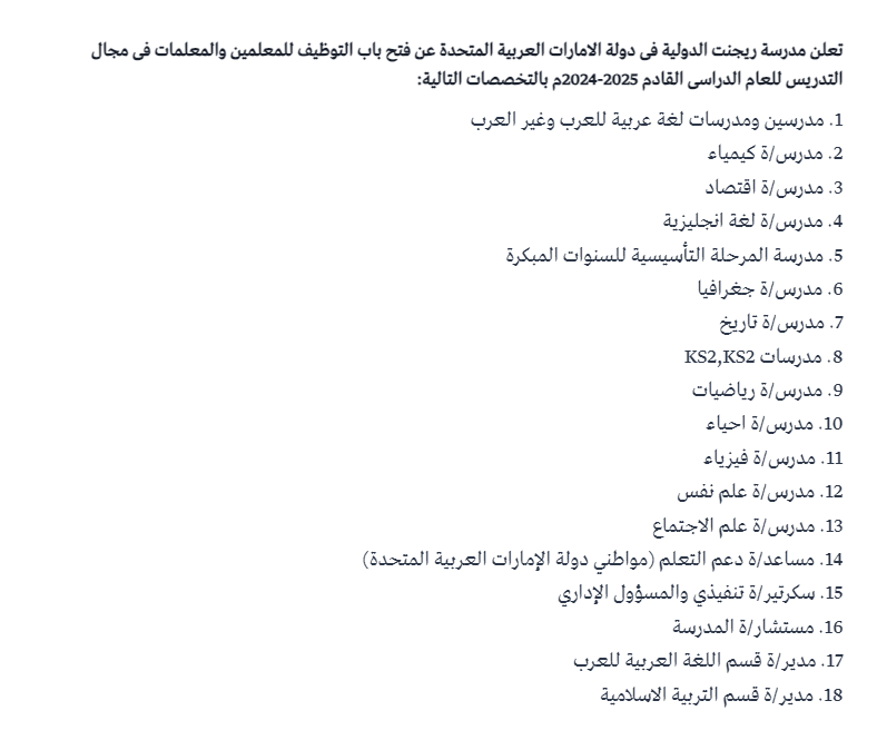تعلن مدرسة ريجنت الدولية في الامارات عن فتح باب التوظيف للمعلمين و المعلمات