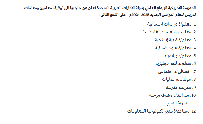 تعلن المدرسة الأمريكية بدولة الامارات عن حاجتها لتعيين مدرسين و مدرسات ضمن التخصصات التالية :