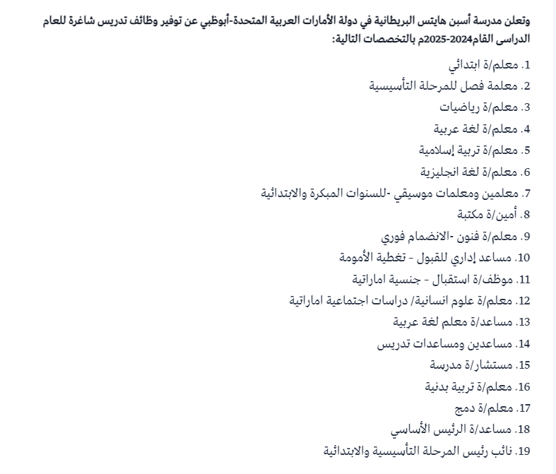 تعلن مدرسة أسبن هايتس في إمارة أبو ظبي عن حاجتها لتعيين مدرسين