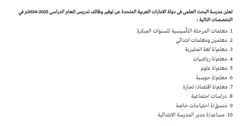 تعلن مدرسة البحث العلمي عن حاجتها لتعيين مدرسين ضمن التخصصات التالية
