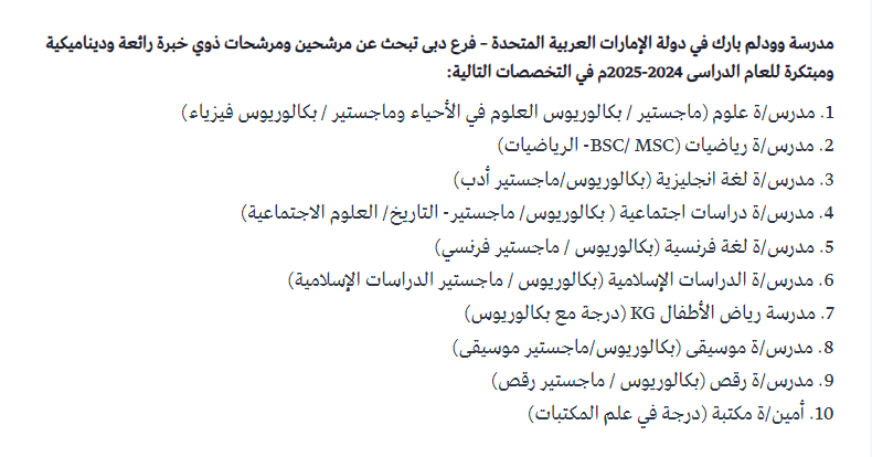 فرص متاحة للمدرسين في مدرسة وولدم بارك فرع دبي ضمن التخصصات التالية