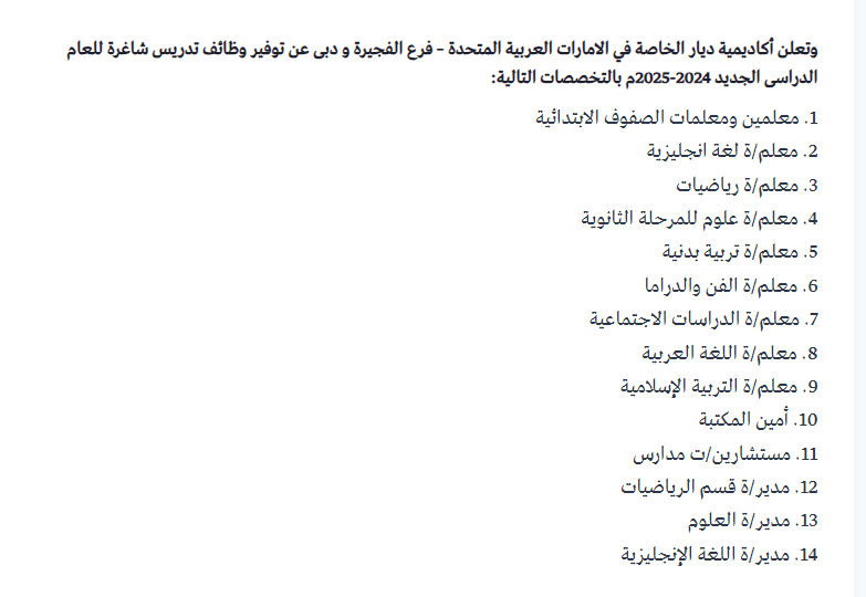 أكادمية ديار الخاصة تعلن عن فرص عمل للمدرسين في فرع دبي و الفجيرة ضمن تخصصات التالية