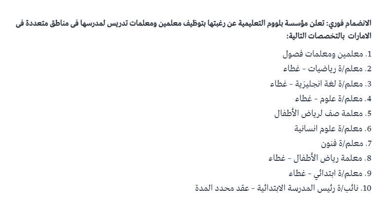 للانضمام الفوري تعلن مؤسسة بلووم التعليمية عن حاجتها لمدرسين ومدرسات برواتب تصل الى 12 الف درهم ضمن التخصصات التالية