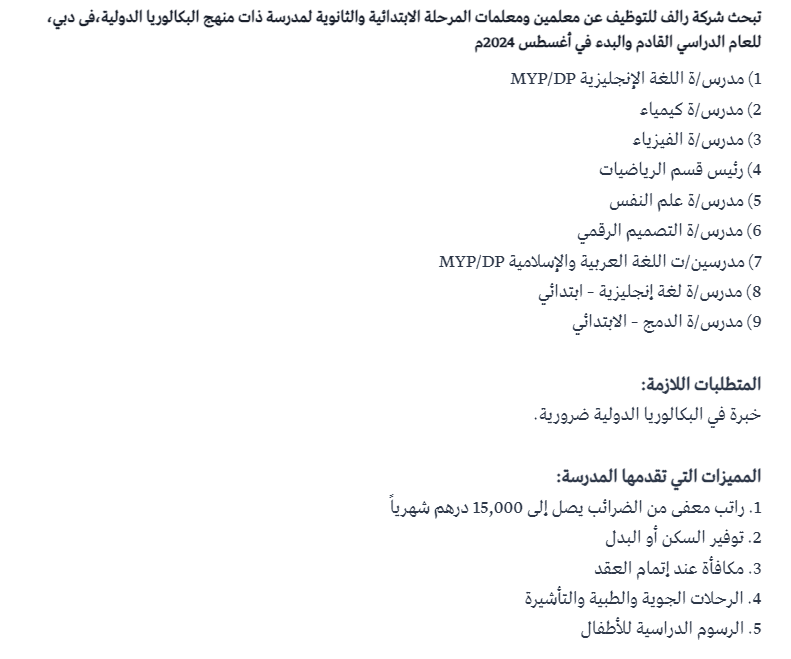 براتب 15 الف درهم تعلن شركة رالف للتوظيف عن حاجة مدرسين ومدرسات ابتدائي وثانوي للانضمام المباشر