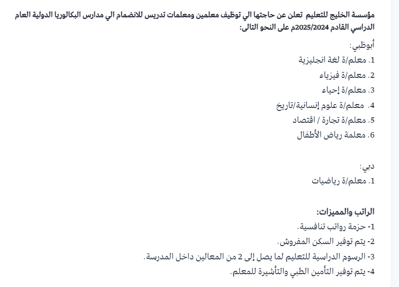 برواتب عالية وتنافسية تعلن مؤسسة الخليج عن حاجتها لمدرسين ومدرسات البكالوريا
