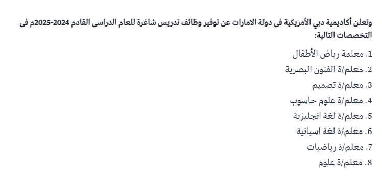 تعلن أكادمية دبي الأمريكية عن حاجتها لتعيين مدرسين ومدرسات برواتب جيدة ضمن التخصصات التالية