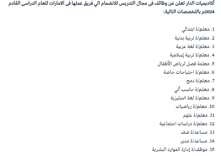 تعلن اكاديميات الدار عن وظائف شاغرة للمدرسين و المدرسات في الامارات ضمن التخصصات التالية