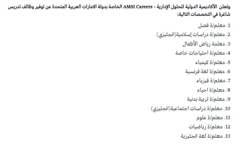 برواتب تصل الى 15 الف درهم تعلن الاكادمية الدولية للحلول الادارية عن حاجتها لمدرسين و مدرسات ضمن تخصصات التالية