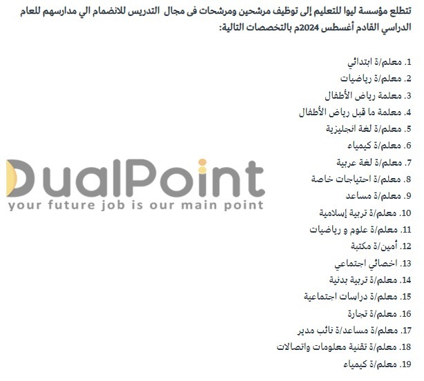 برواتب تصل الى 15 الف درهم تعلن مؤسسة ليوا عن حاجتها لتعيين مدرسين ومدرسات ضمن التخصصات التالية :